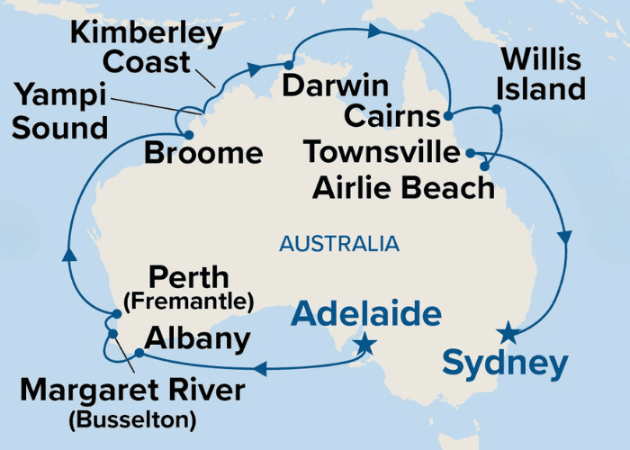 - 23 night Round Australia Cruise from Adelaide to Sydney onboard Grand Princess® including onboard entertainment, main meals and port taxes